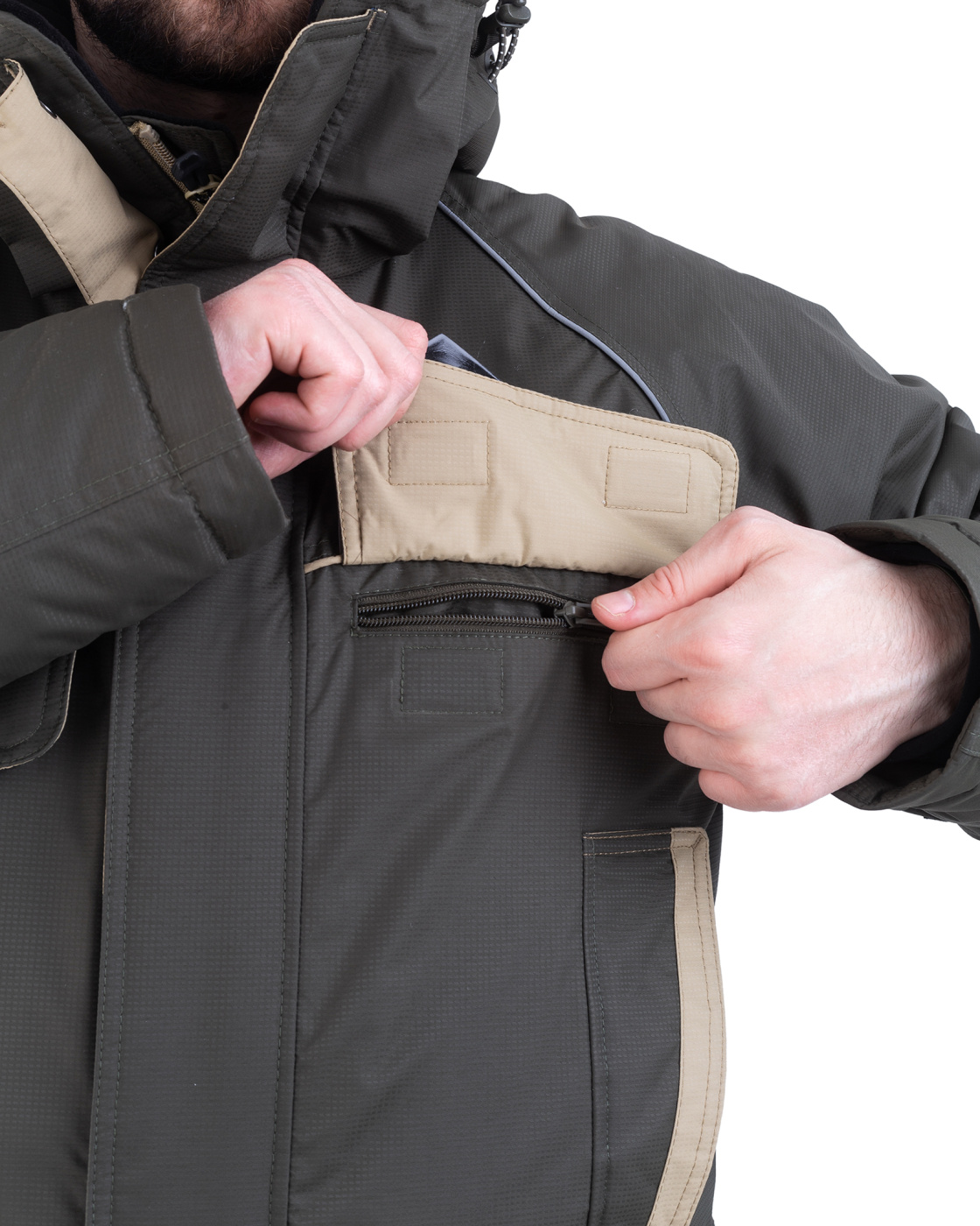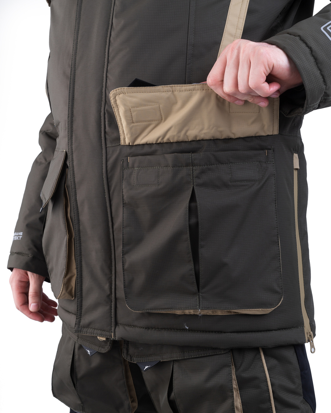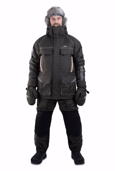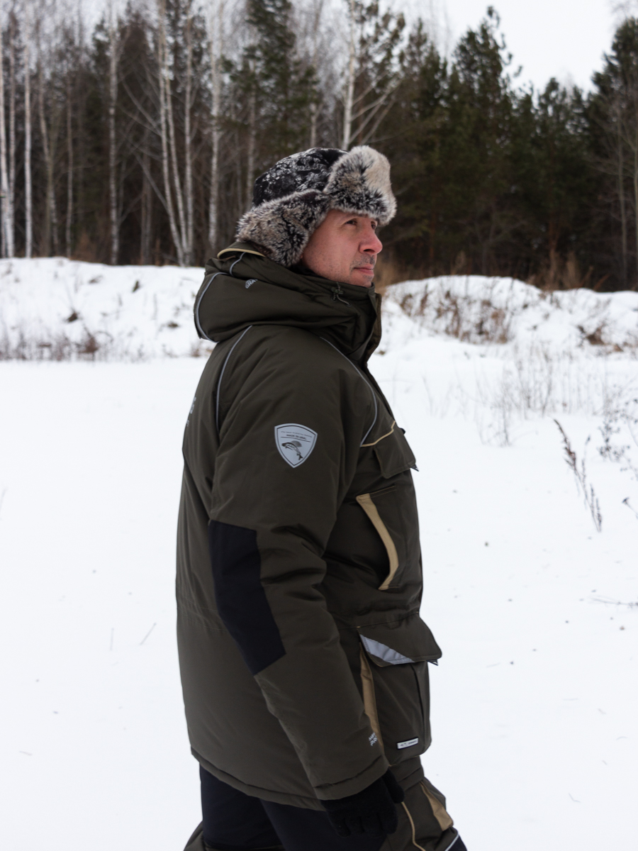 Костюм «Камчатка» для зимней рыбной ловли. Мембранная ткань не продувается и не промокает. Отделка укрепляет износостойкие места (локти, зона сидения, колени).