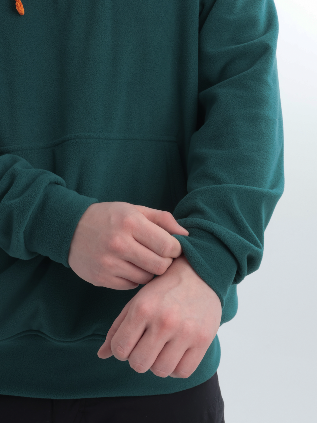 Толстовка оснащена удобным капюшоном, который защитит вас от ветра, и эластичными манжетами на рукавах и по низу, что обеспечивает плотную посадку и предотвращает попадание холодного воздуха. Просторные карманы добавляют практичности, позволяя хранить мелкие предметы под рукой.